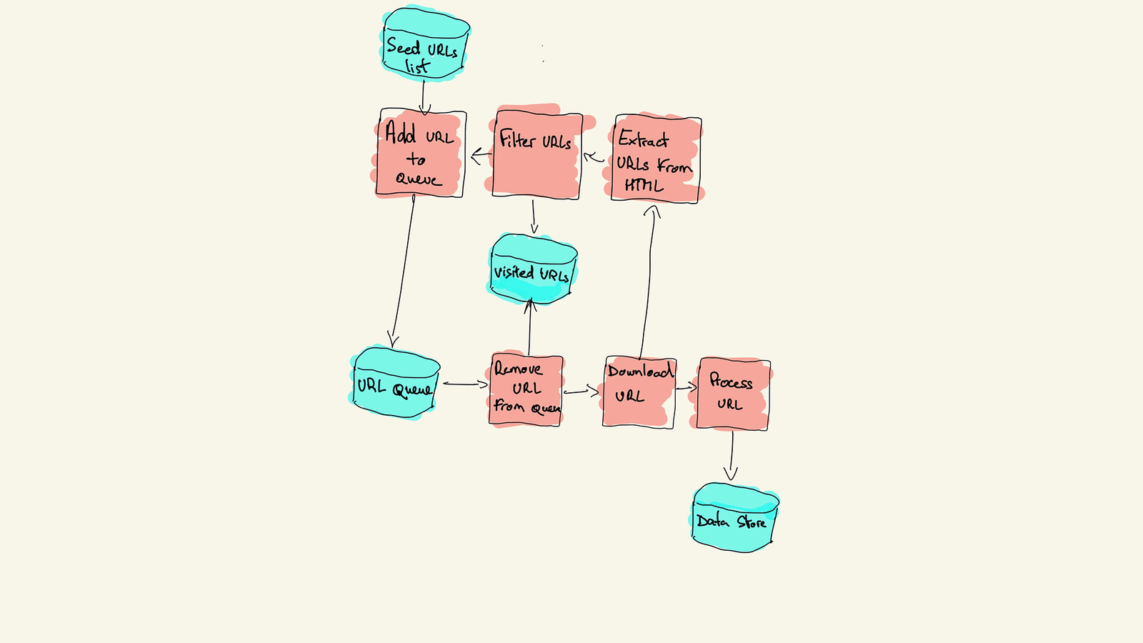 Proses kerja web crawler dimulai dengan memuat biji ke dalam antrian. Setelah itu, crawler mengunduh halaman web dari URL tersebut dan mengekstrak informasi seperti teks, gambar, dan tautan. Informasi ini kemudian disimpan dalam basis data untuk diindeks oleh mesin pencari. Mesin pencari menggunakan hasil dari web crawler untuk menyediakan hasil pencarian yang relevan dan terstruktur kepada pengguna.